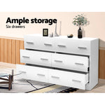 Practical and handsome, our Artiss 6-drawer Lowboy is perfect for those looking for extra storage space for your home. Contemporary and simply designed, this beauty features a flawless melamine finish with elegant handles that will easily match your home d��cor. Made with premium 15mm thick particle board with anti-rust coated drawer runners, our lowboy works ever so smoothly with minimum hassle. Not least, it provides plenty of storage space with six generous-sized drawers for all your clothing, fashion essentials and more.