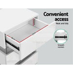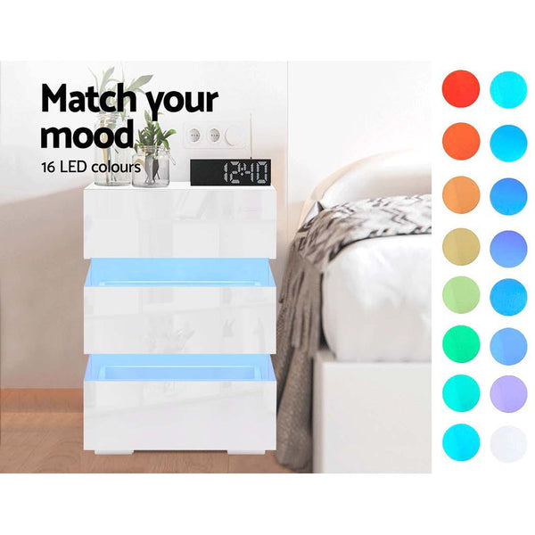 Tired of fumbling in the dark for a light switch in the middle of the night? With our Artiss LED Bedside Table, your problems are solved. The bedside table comes with built-in LED lighting that can be customised into 16 different colours and 4 different effects to suit your preference. Not only will it create a beautiful ambience, it will also save you from buying extra bedside lamps or nightlights. Three deep drawers sliding on smooth coated runners provide ample storage space. Better still, the handle-free design gives it a modern vibe that stands out from the mundane. Constructed from quality particle board and acrylic glass with smooth melamine finish and high-gloss UV front, the bedside table is durable and easy to maintain. And it will be the perfect addition to your modern bedroom with its contemporary and linear design. Or you can even keep one in the living room to wow all your houseguests.